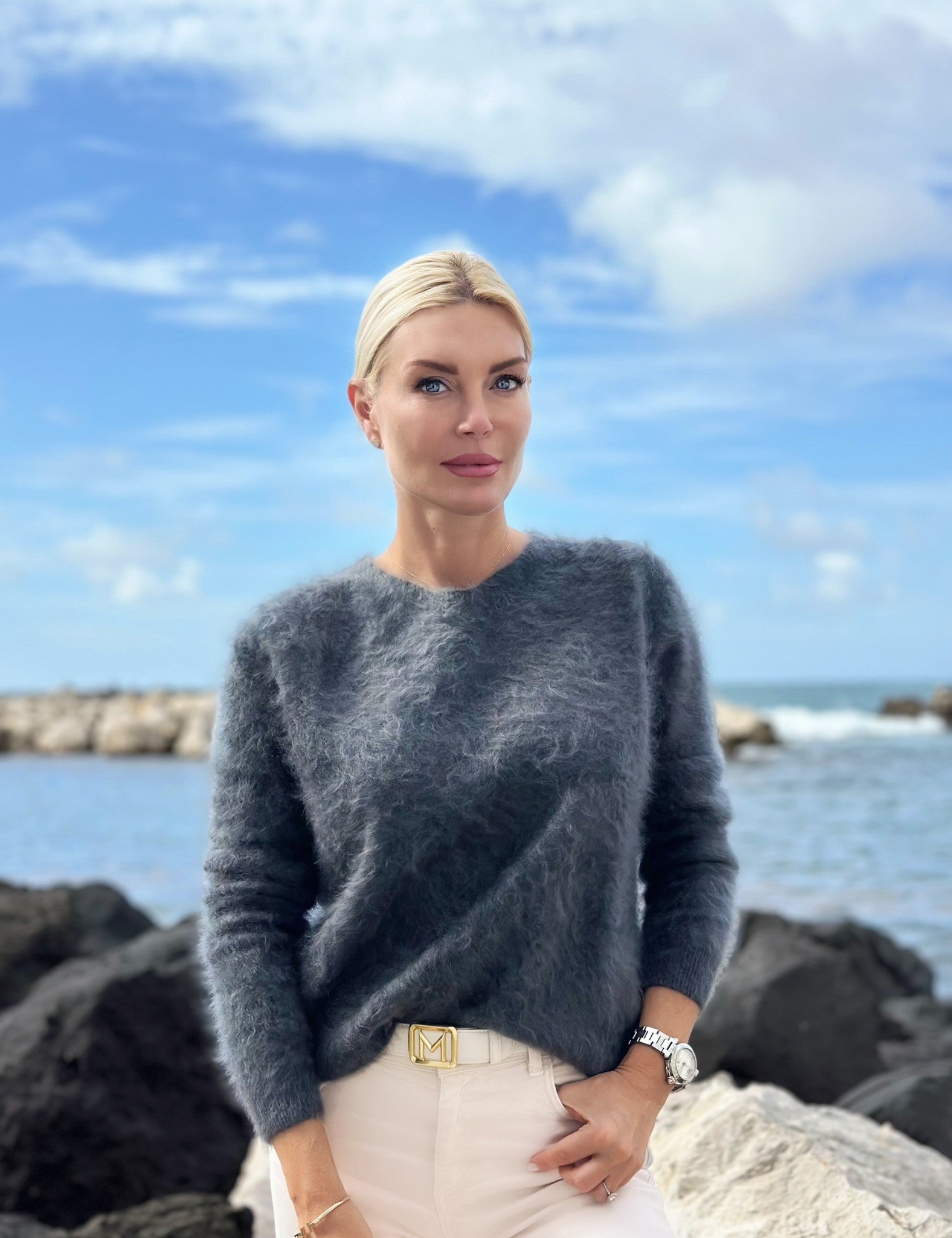 Leicht oversized geschnitten für zeitlose, mühelose Eleganz, dennoch bequem auch unter Mänteln und Jacken zu tragen.