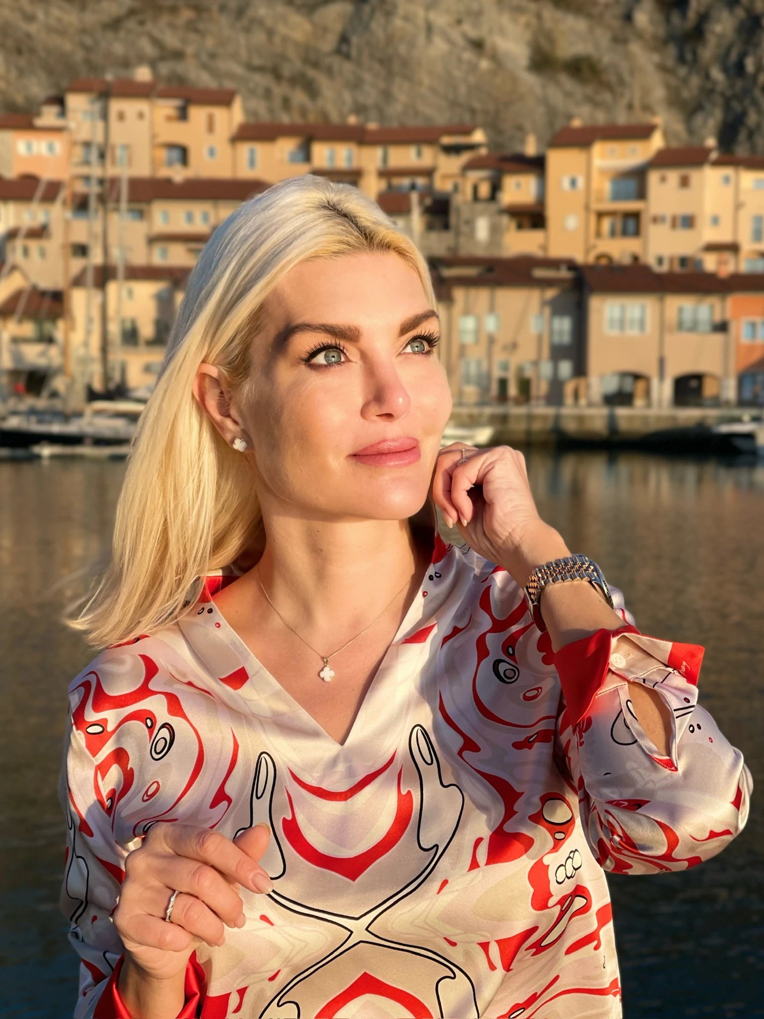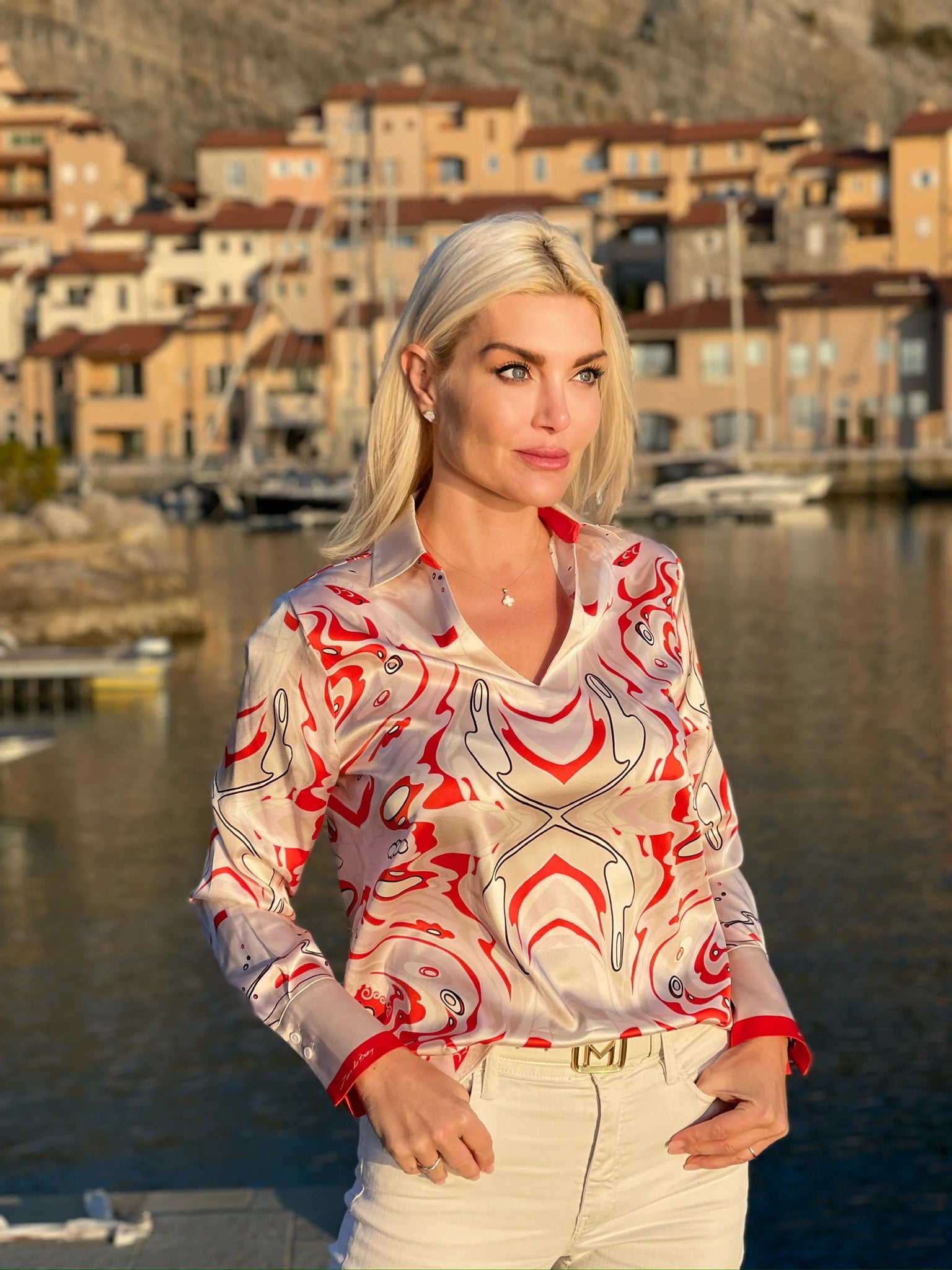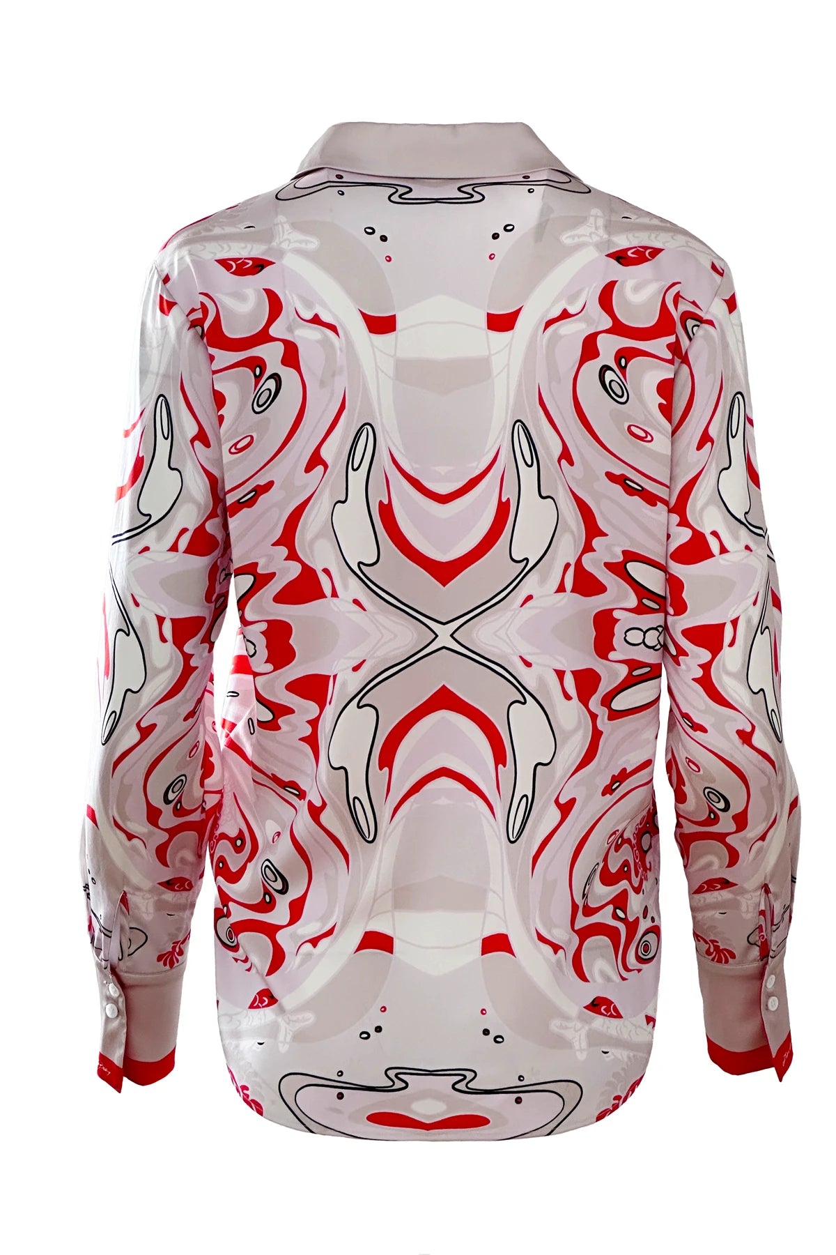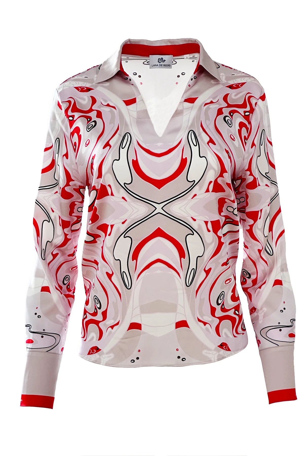 Elegante und federleichte Seidenbluse aus Stretch-Satin mit Unikat Künstler-Print "onda rossa" in wunderschönen, leuchtenden Farben.
