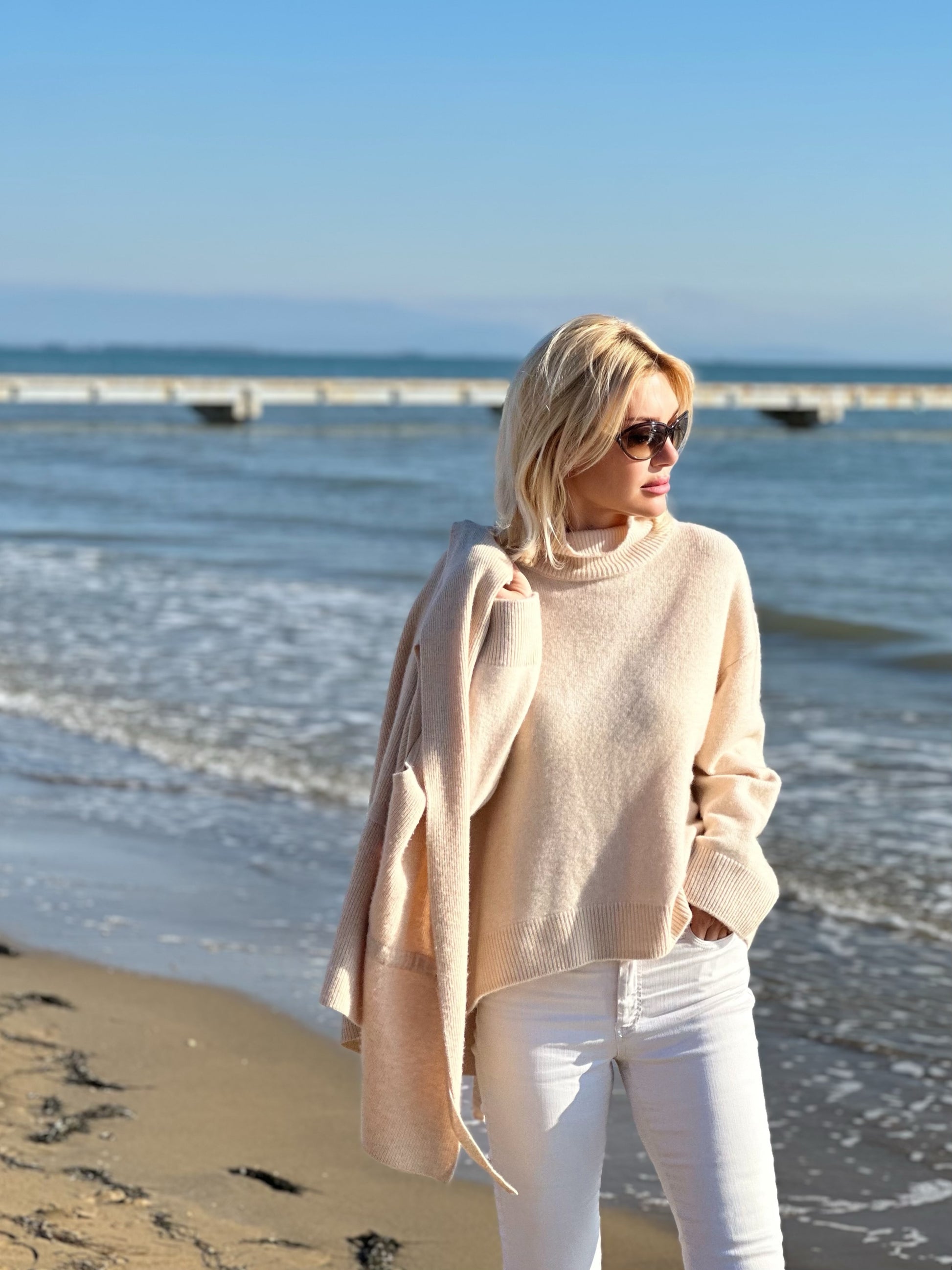Leicht oversized geschnitten für zeitlose, mühelose Eleganz, dennoch bequem auch unter Mänteln und Jacken zu tragen.