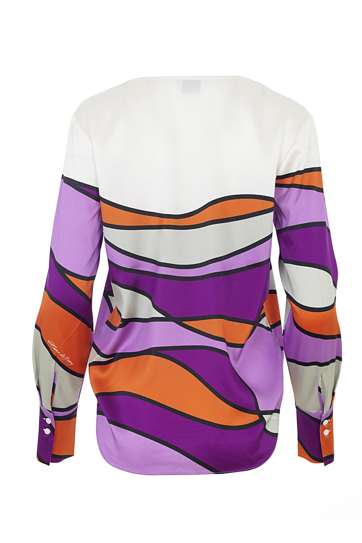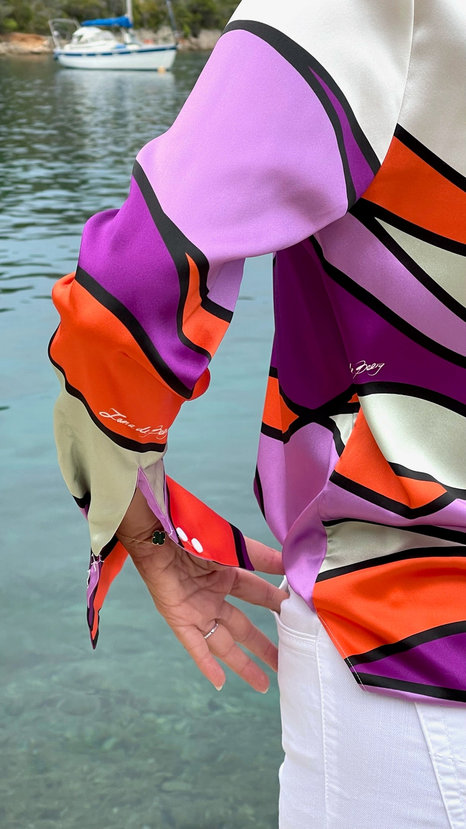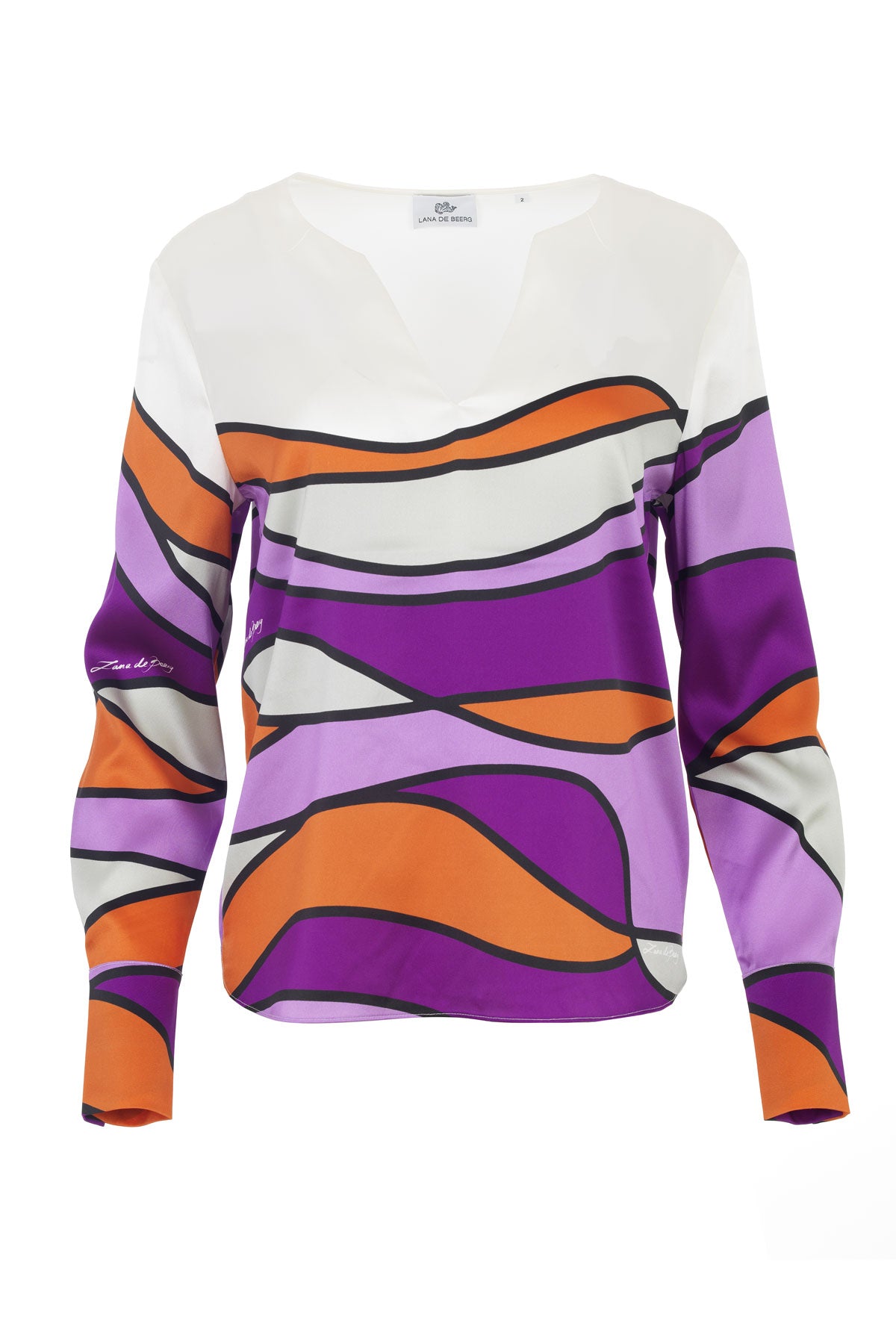 Elegante und federleichte Seidenbluse aus Stretch-Satin mit Unikat Künstler-Print "onda" in wunderschönen, leuchtenden Farben und LANA DE BEERG Logo.