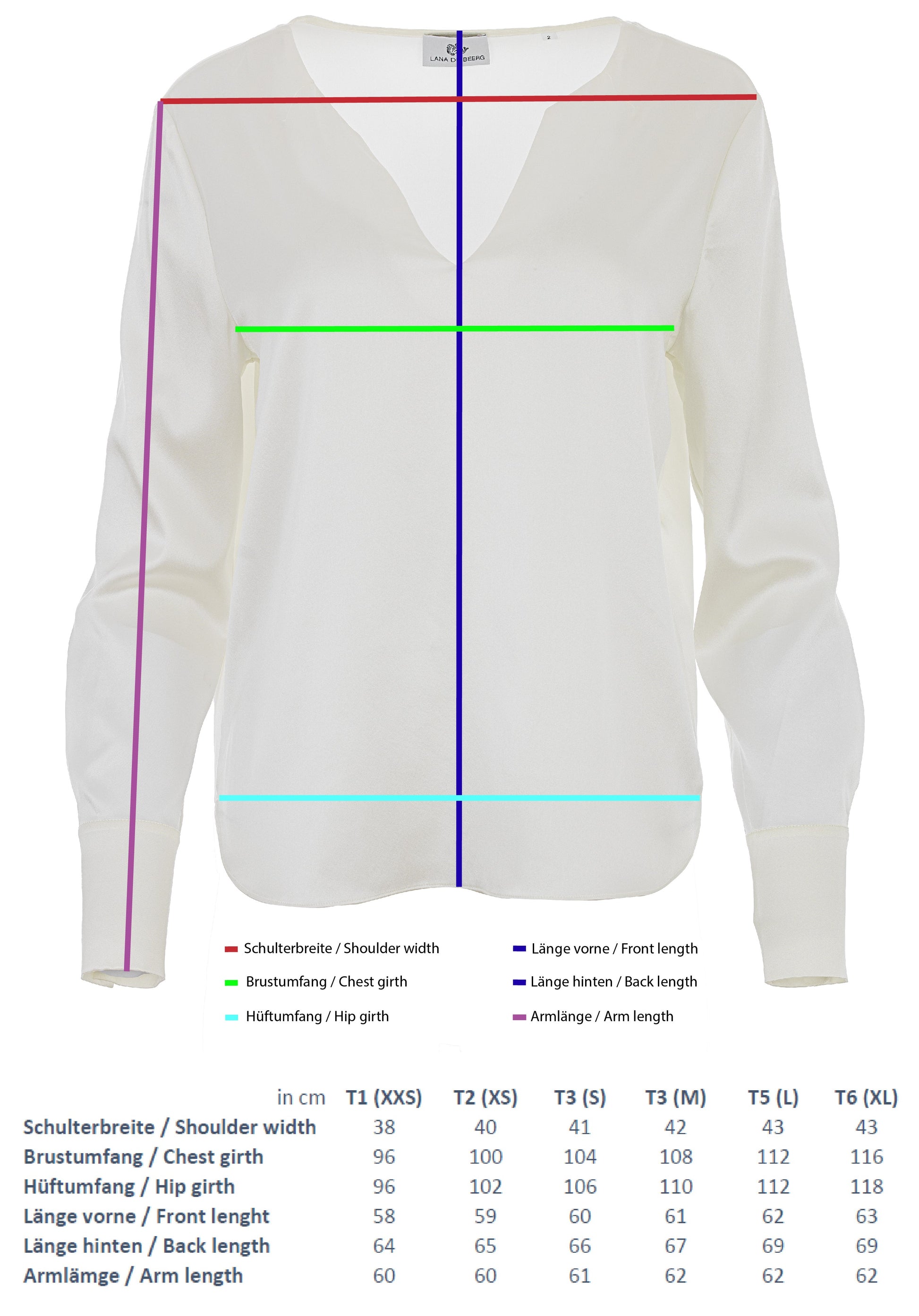 Das Model trägt T2 (XS), bei 174cm Körpergröße. Bitte beachten Sie die Maßtabelle und finden so die perfekte Größe.