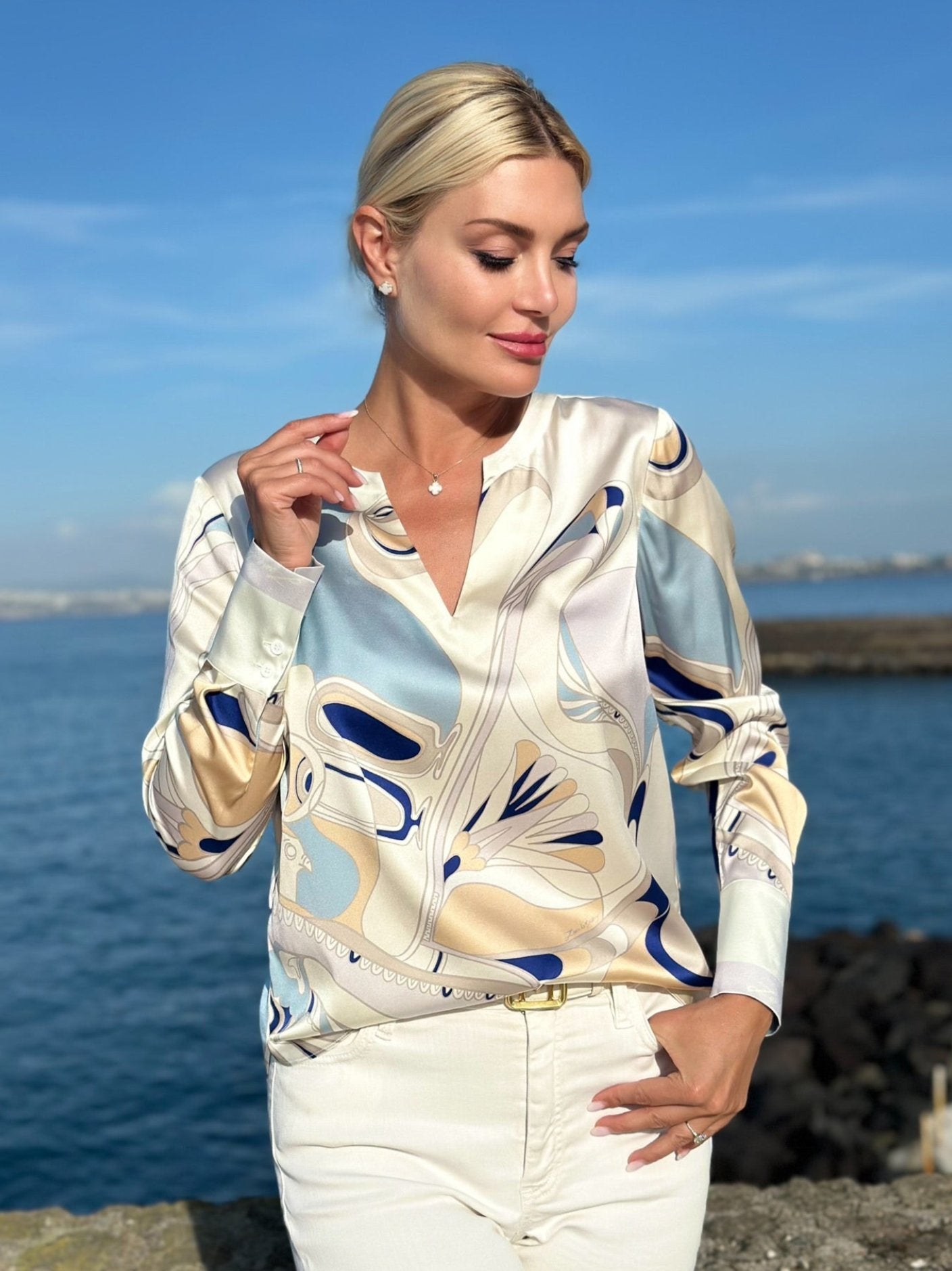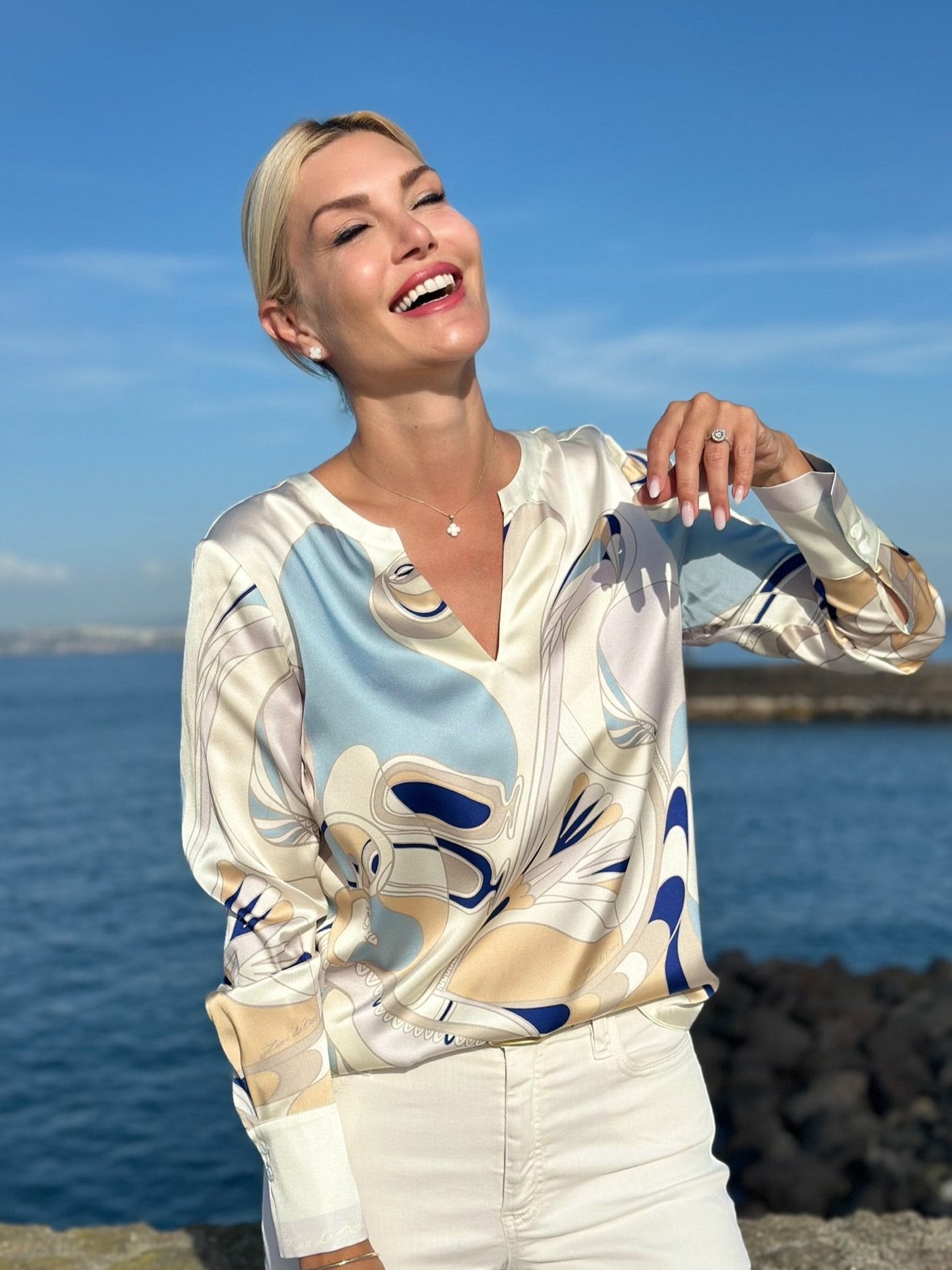Elegante und federleichte Seidenbluse aus Stretch-Satin mit Unikat Künstler-Print "falco immortale" in wunderschönen, leuchtenden Farben und LANA DE BEERG Logo.