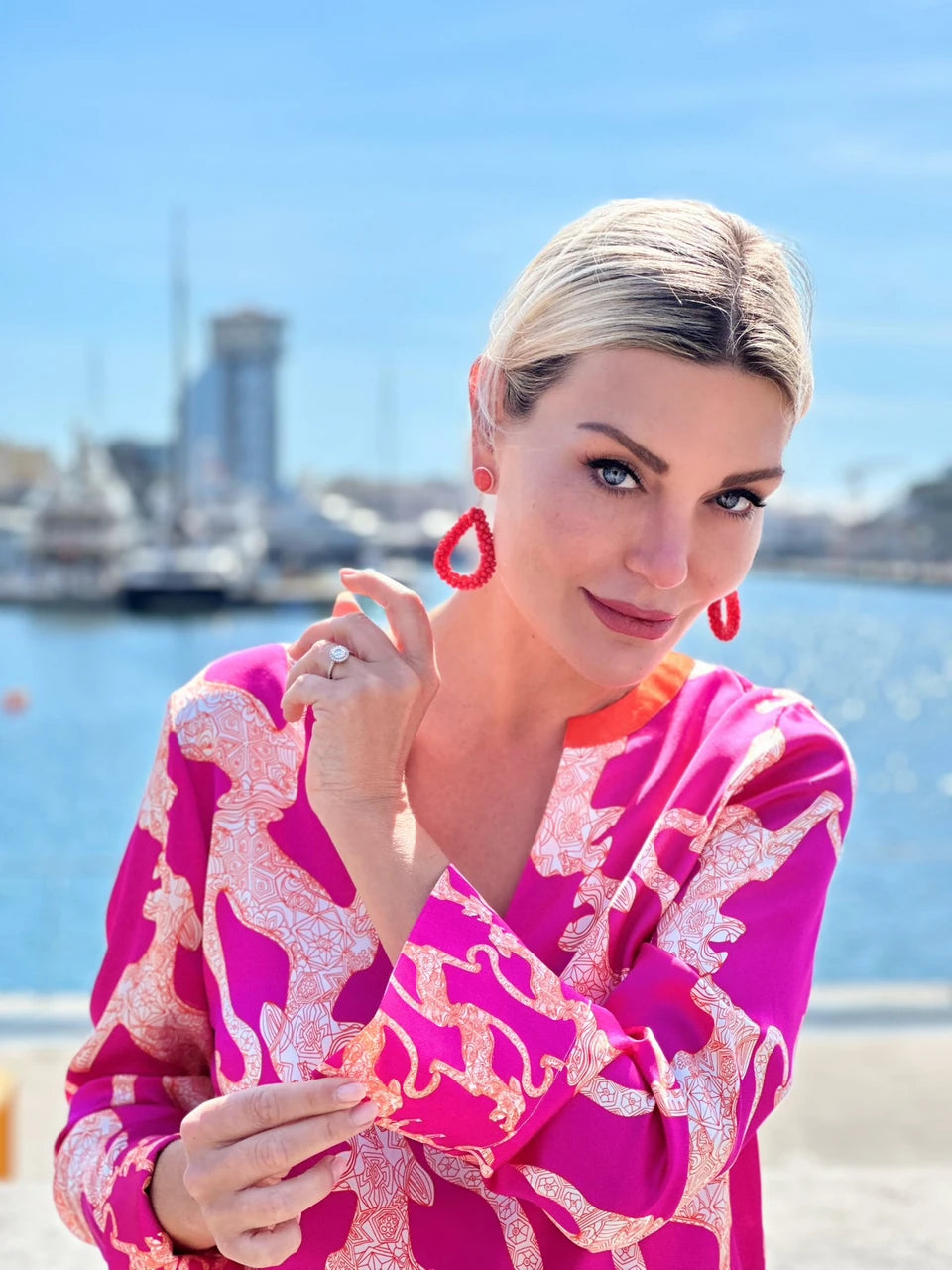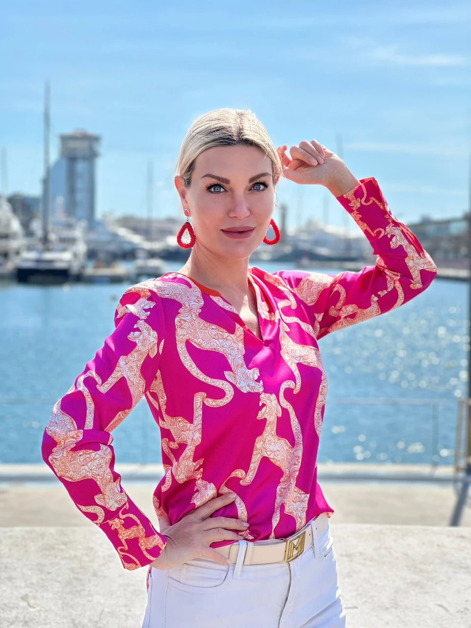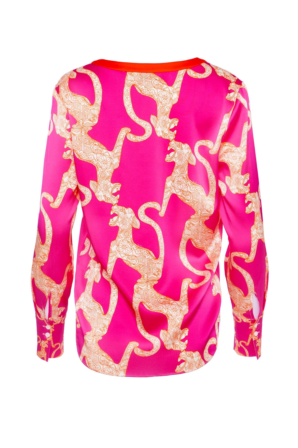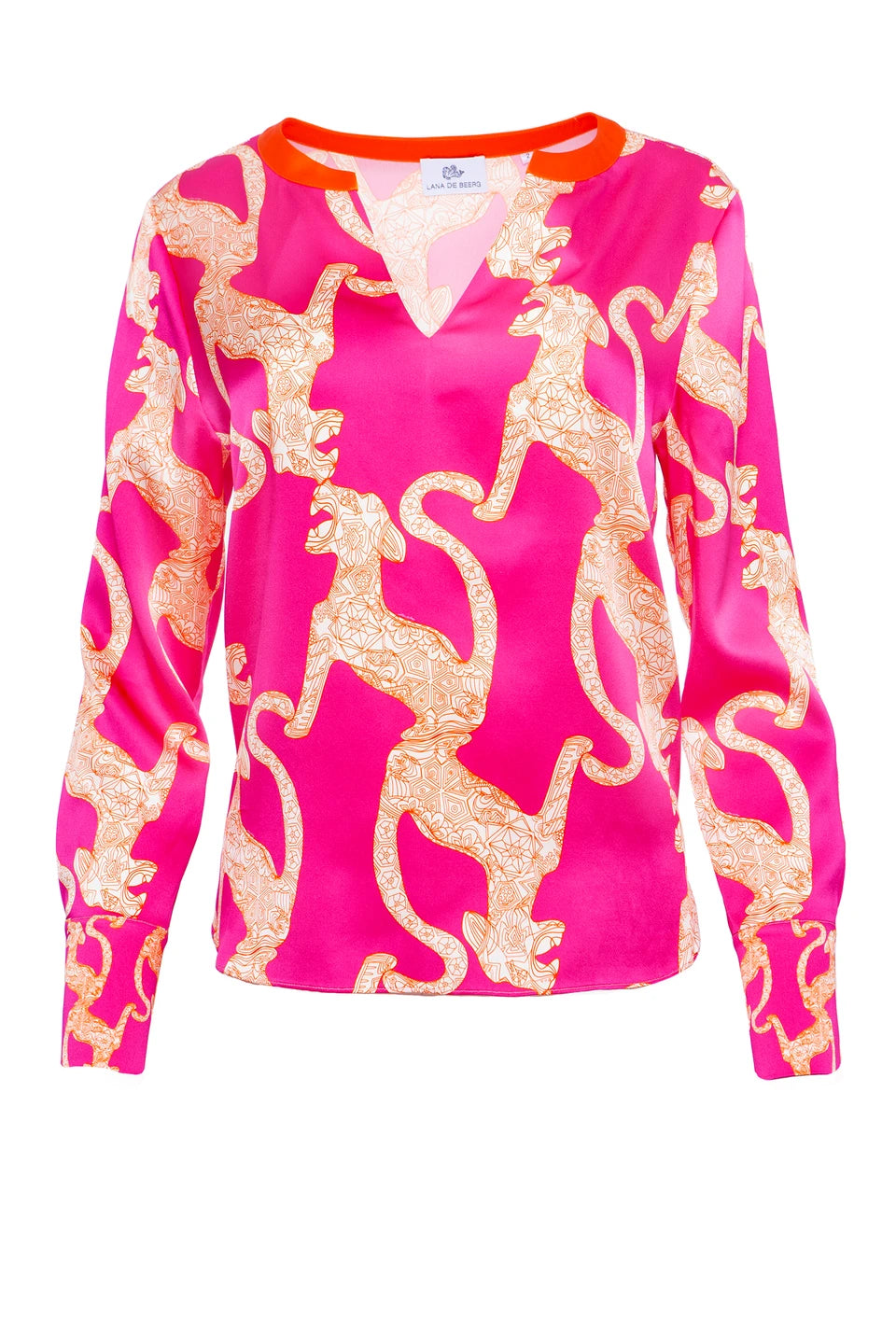 Elegante und federleichte Seidenbluse aus Stretch-Satin mit Unikat Künstler-Print "puma concolor" in wunderschönen, leuchtenden Farben und LANA DE BEERG Logo.