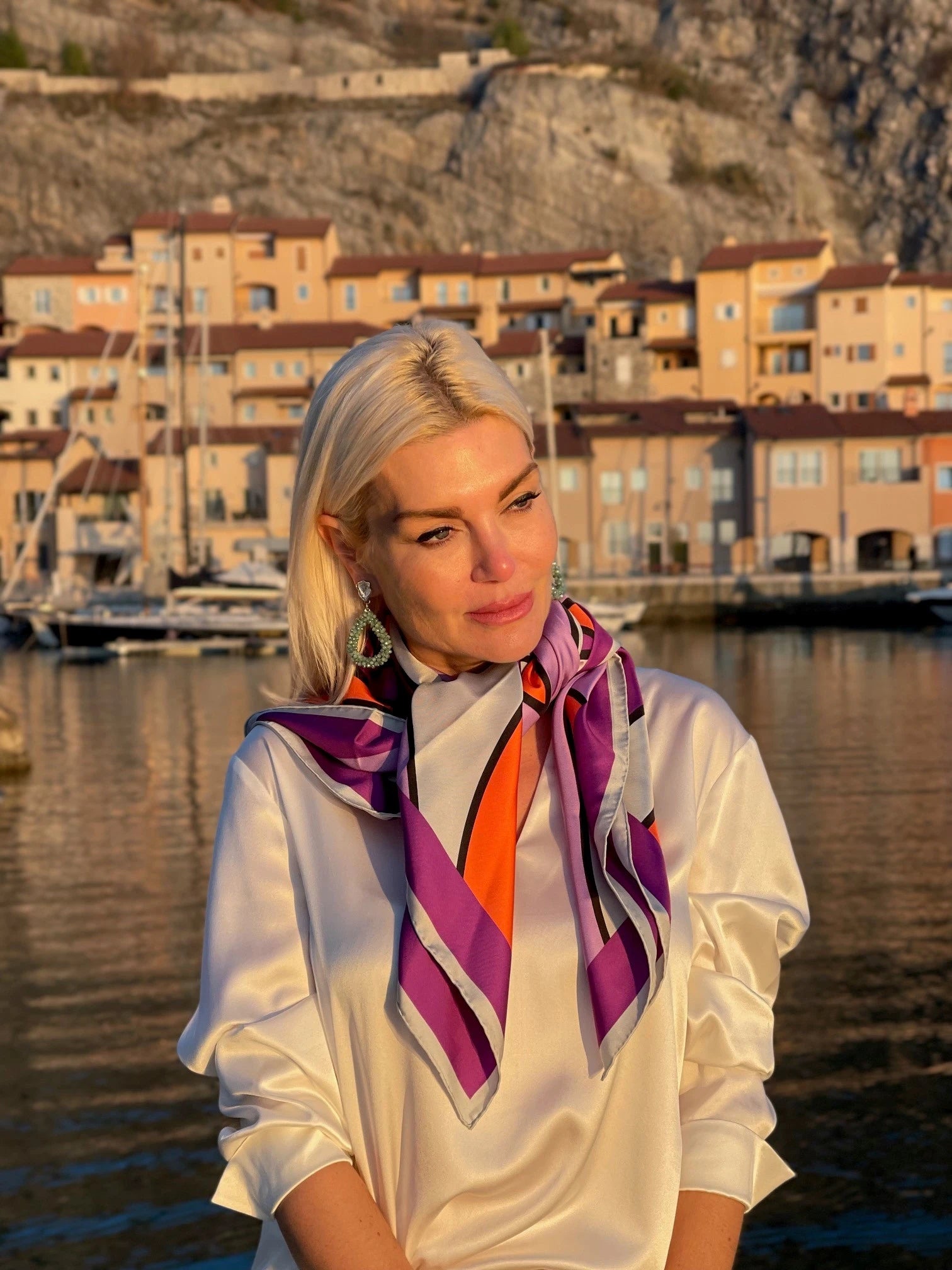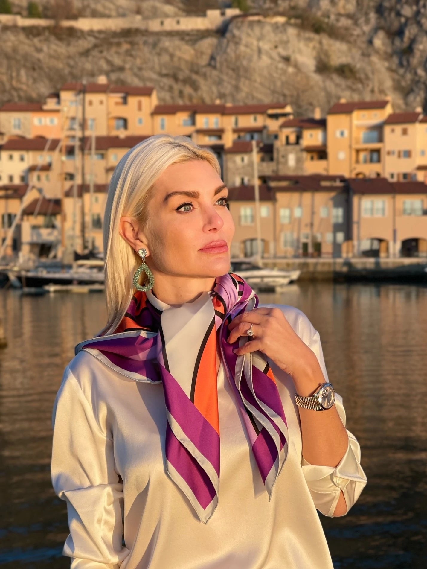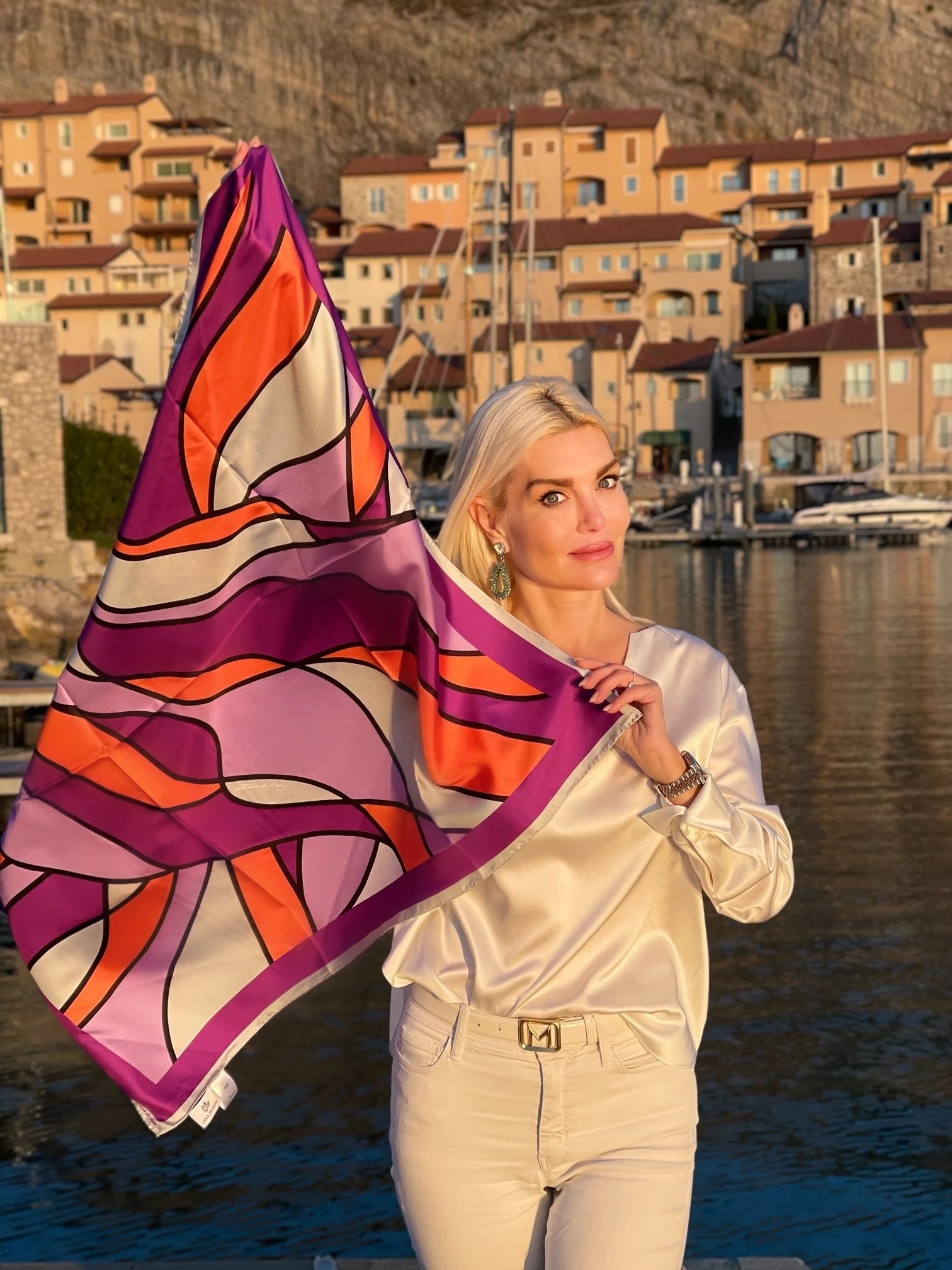 LANA DE BEERG Seiden-Carré als Inbegriff der zeitlosen Eleganz, vielseitig verwendbar, passend zu jeder Jahreszeit. Einzigartig leuchtender Künstlerdruck "onda nouva" mit LANA DE BEERG Logo. Nicht nur, aber auch ideal kombinierbar zu LANA DE BEERG Bluse ARIA "onda".