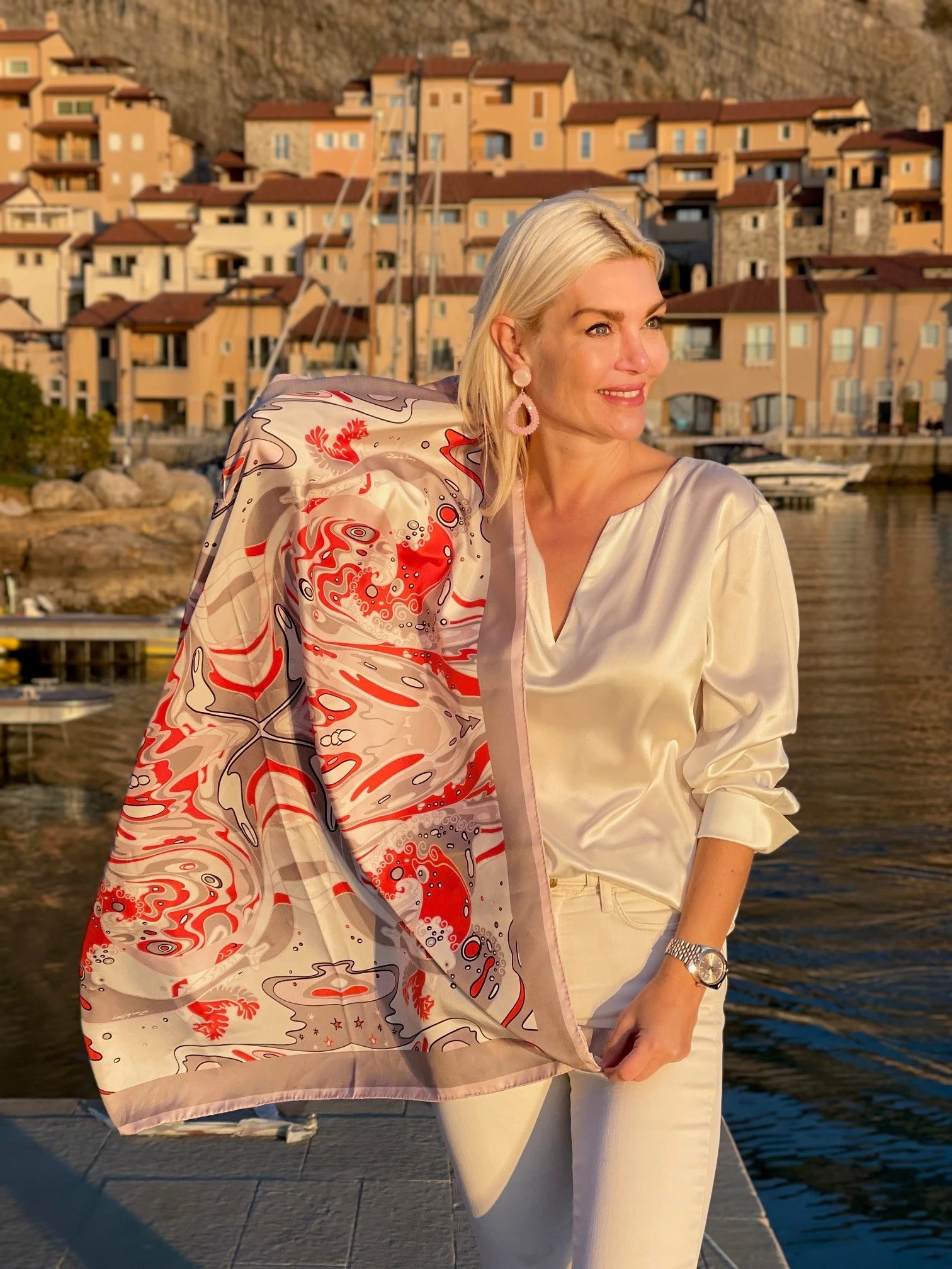 LANA DE BEERG Seiden-Carré als Inbegriff der zeitlosen Eleganz, vielseitig verwendbar, passend zu jeder Jahreszeit. Einzigartig leuchtender Künstlerdruck "onda rossa" mit LANA DE BEERG Logo.