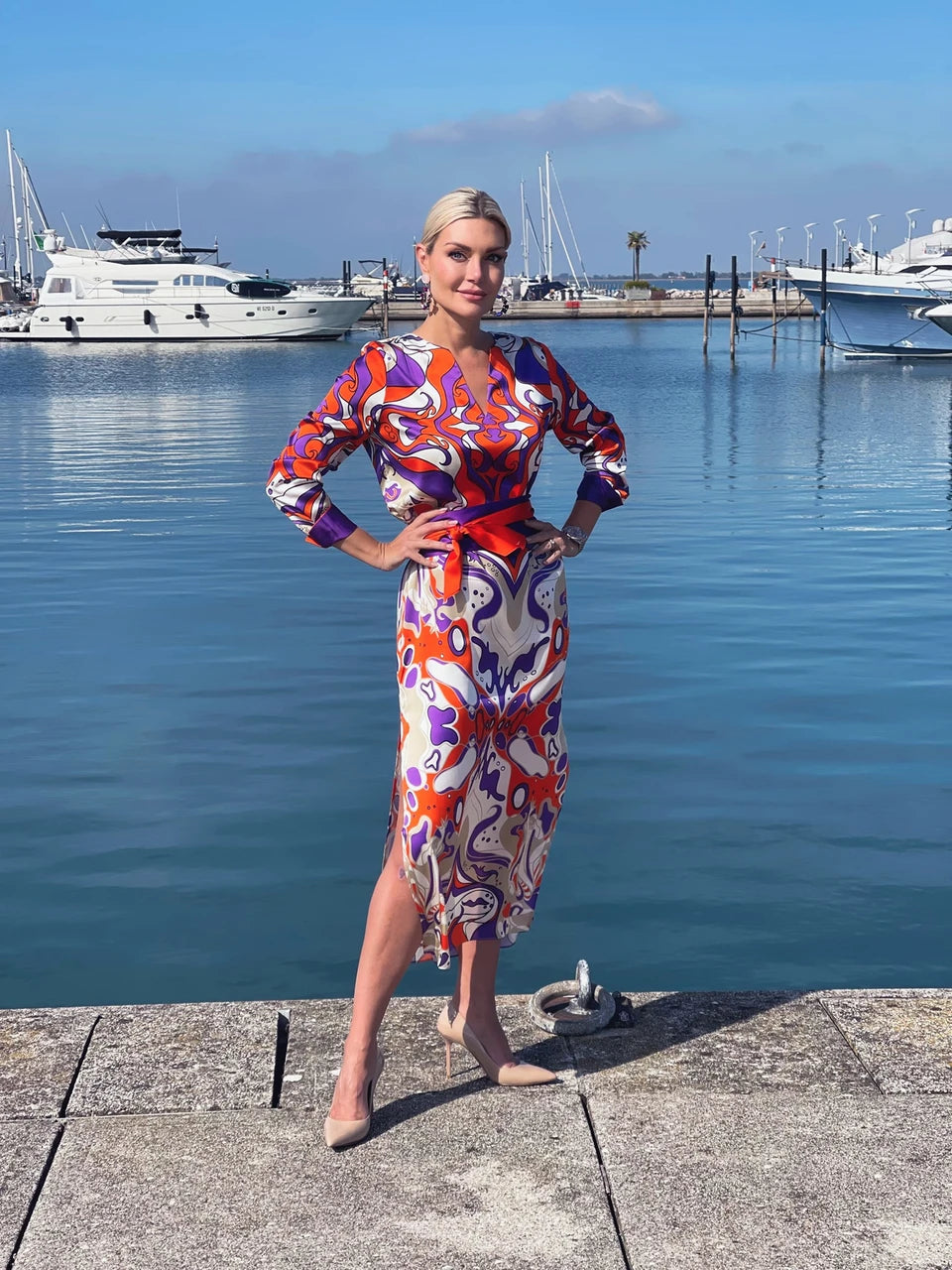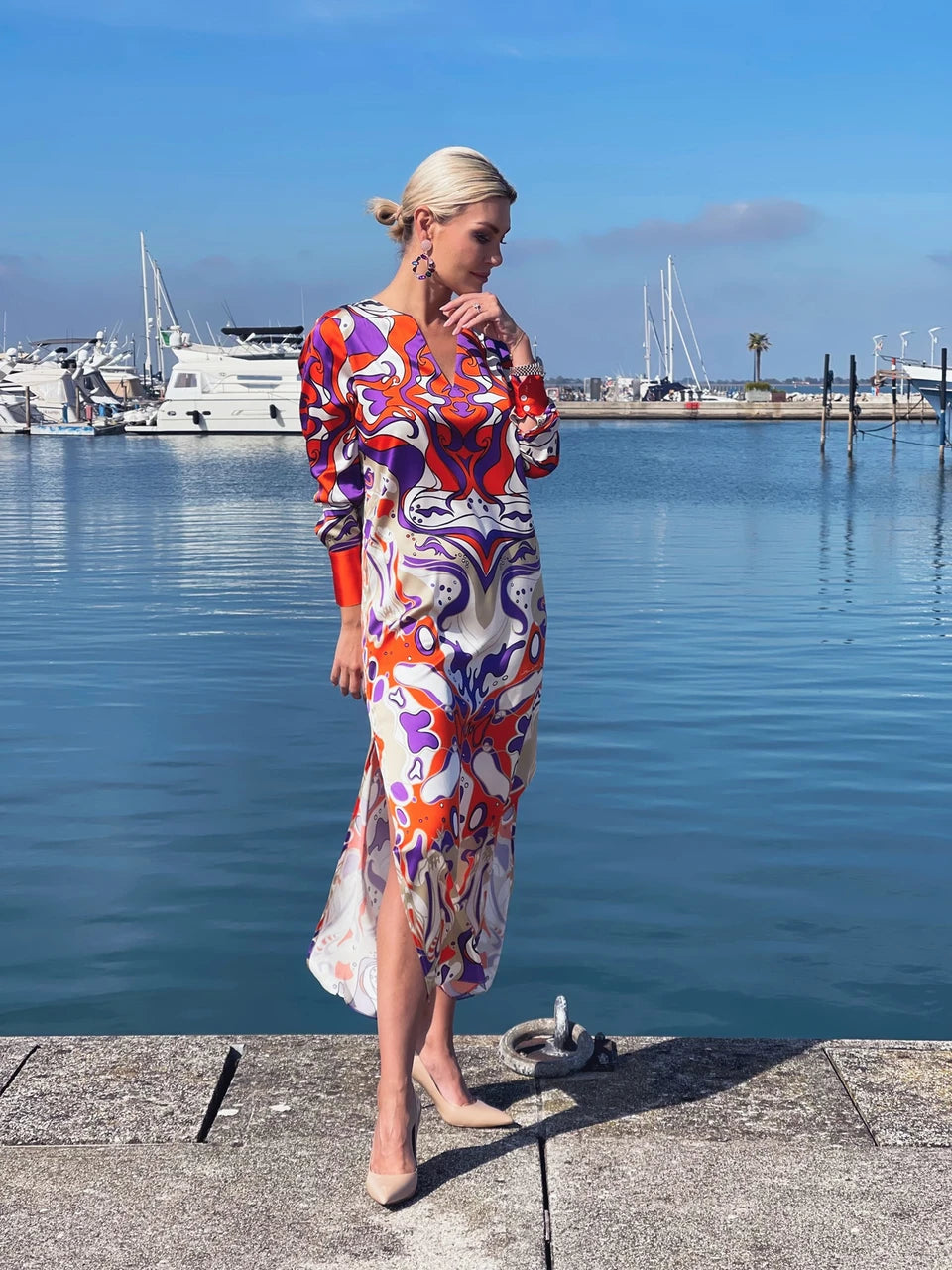 Elegantes und federleichtes, langes Seidenkleid aus Stretch-Satin mit Unikat Künstler-Print "bellezza orange" in wunderschönen, leuchtenden Farben.