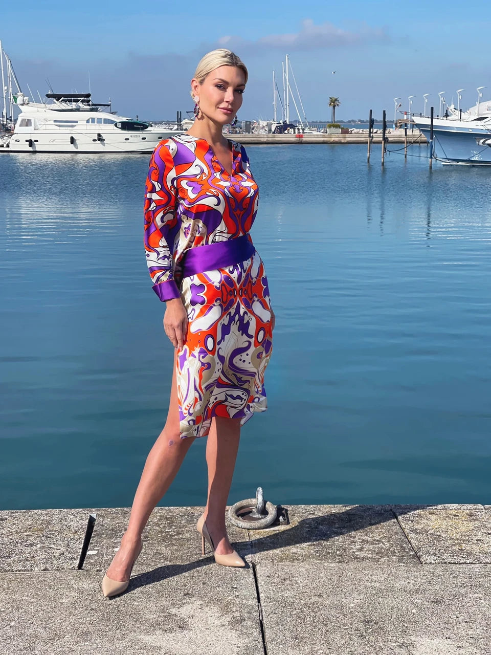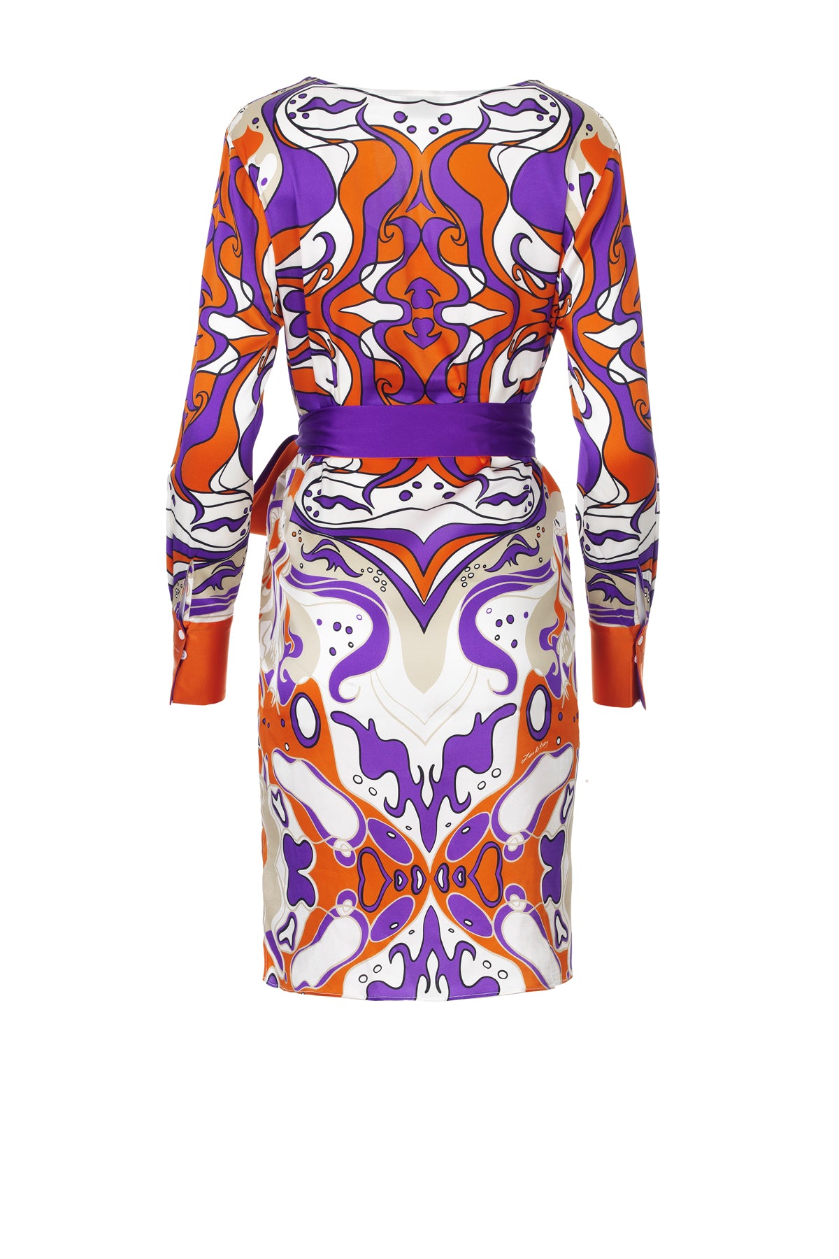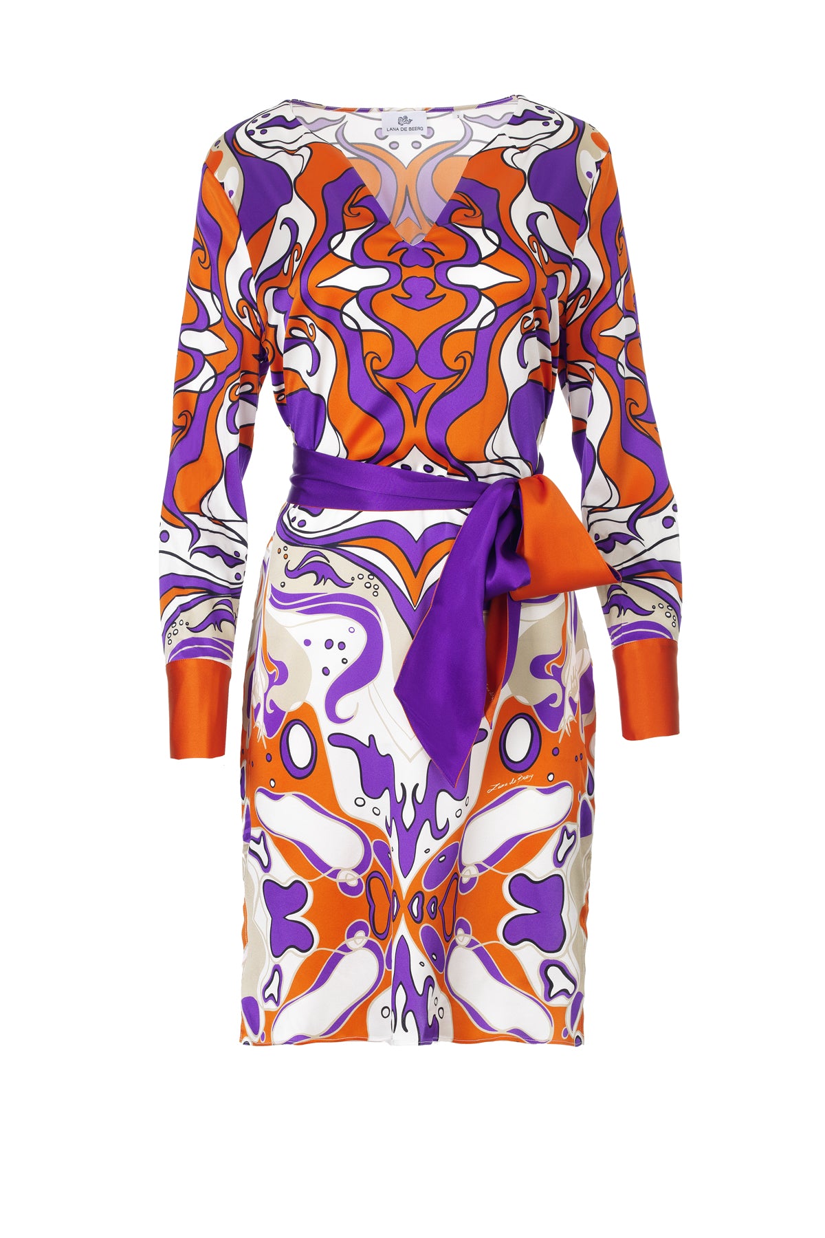 Elegantes und federleichtes, kurzes/knielanges Seidenkleid aus Stretch-Satin mit Unikat Künstler-Print "bellezza orange" in wunderschönen, leuchtenden Farben.